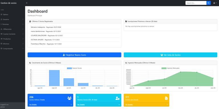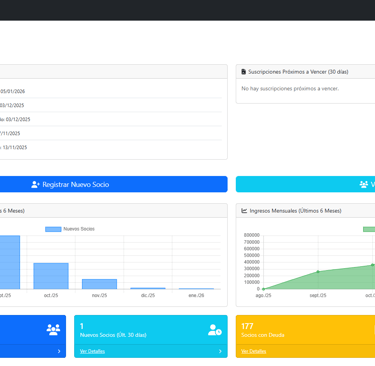 Gestión de Socios es un sistema administrativo que permite registrar, organizar y controlar socios de forma eficiente. Ofrece un dashboard con indicadores clave como altas recientes, crecimiento, ingresos mensuales, estado de suscripciones y control de deudas, facilitando la toma de decisiones y el seguimiento financiero.